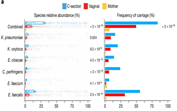 而一些和醫(yī)院環(huán)境有關(guān)的病原體則更容易占據(jù)剖腹產(chǎn)嬰兒的腸道,包括腸球菌屬(Enterococcus)、腸桿菌屬(Enterobacter)和克雷伯氏菌(Klebsiella species)等大多是醫(yī)院中常見(jiàn)的機(jī)會(huì)致病菌,在某些情況下會(huì)導(dǎo)致宿主感染,引起疾病。約83%的剖腹產(chǎn)嬰兒攜帶潛在的致病菌,而陰道分娩嬰兒只有49%左右攜帶概率。