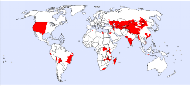 2016年3月自然發(fā)生鼠疫在全球的分布