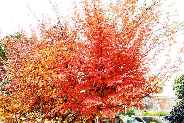 雞爪槭(Acer palmatum Thunb.):紅色葉樹種,又名七角楓。落葉小喬木,樹冠傘形,葉近圓形,基部心形或近心形,掌狀,常7深裂,密生尖鋸齒。葉形美觀,入秋后變?yōu)轷r紅色,為優(yōu)良的觀葉樹種。雞爪槭是園林中名貴的觀賞鄉(xiāng)土樹種,常用來營造“萬綠叢中一點紅”的景觀。