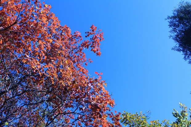 秋季的紅色葉樹種則多是花青素與葉綠素的含量變化導(dǎo)致的。溫度下降導(dǎo)致葉綠素含量降低,植物為了抵御嚴(yán)寒合成更多的糖分,而這些糖分又有利于葉片中的花青素形成,葉片中的花青素遇到酸性物質(zhì)就會變成紅色。