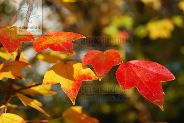 烏桕(Sapium sebiferum (L.)):紅色葉樹種。落葉喬木,葉片菱形、菱狀卵形或稀有菱狀倒卵形,春秋季葉色紅艷奪目,有“烏桕赤于楓,園林二月中”之美名。在園林綠化中可作護堤樹、庭蔭樹及行道樹,有極好的造景效果。