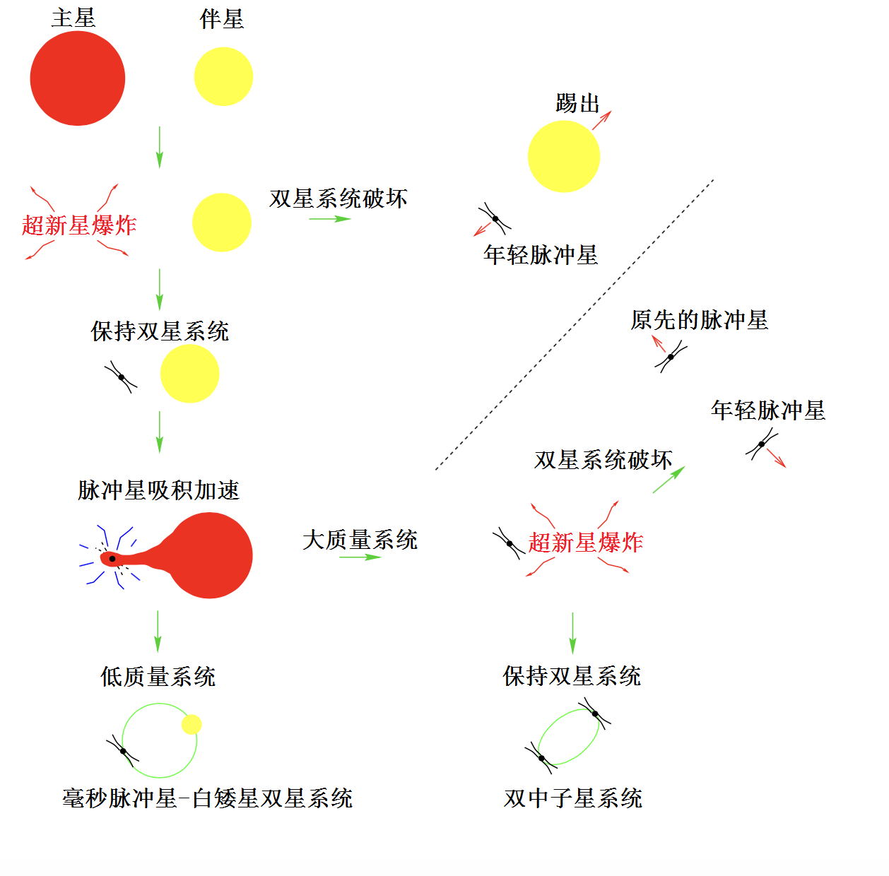 中子星-白矮星和雙中子星雙星系統(tǒng)演化模型。需要注意的是,如果雙中子星系統(tǒng)中只有一顆表現(xiàn)為脈沖星,那該系統(tǒng)也是脈沖雙星,而非雙脈沖星。