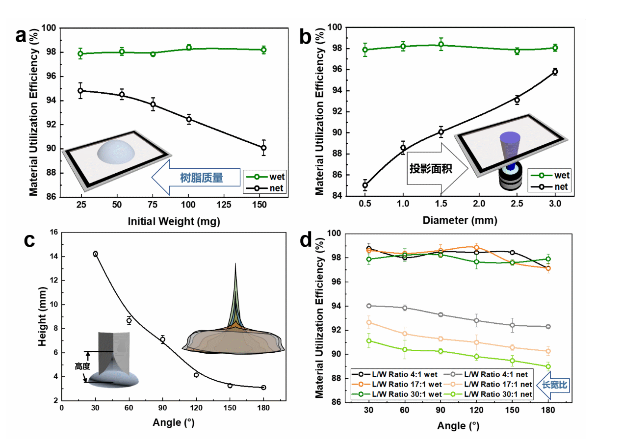 研究人員進(jìn)一步研究了單墨滴3D打印的材料凈利用率,即洗凈的3D結(jié)構(gòu)的質(zhì)量與液滴質(zhì)量的比值。發(fā)現(xiàn)隨液滴質(zhì)量的增加,單墨滴材料利用率降低;隨著UV投影面積的增加,單墨滴材料利用率增加;隨著樹(shù)脂的三維分布增大或長(zhǎng)寬比的增大,單墨滴材料利用率降低,因此可通過(guò)以上因素調(diào)控單墨滴打印的凈利用率,實(shí)現(xiàn)一滴成型。