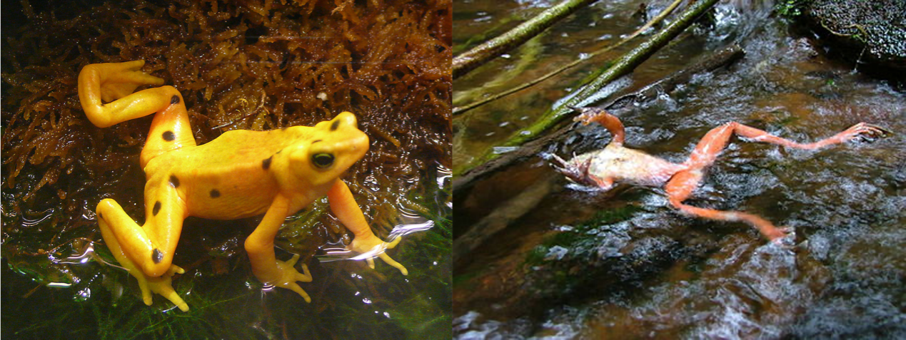 巴拿馬金蛙(左)和染上壺菌?。ㄓ遥┑那嗤苁w,來源:維基百科“巴拿馬金蛙”條目