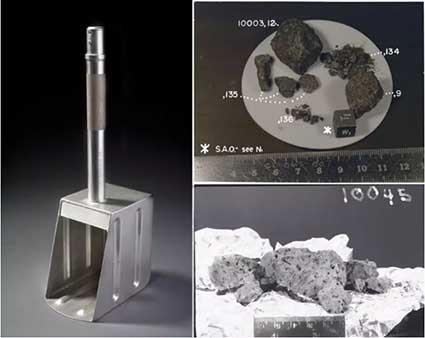 阿姆斯特朗完成第二次采樣所用的鏟子和采回的樣品示例 |?美國國家航空航天博物館&NASA