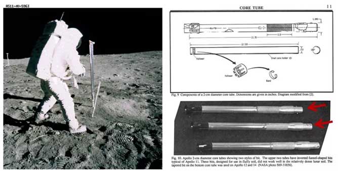 (左)奧爾德林用直徑2厘米的巖管采集了2管深達月表以下13厘米的巖芯樣本;(右)阿波羅11號使用的采樣管長這樣(紅色箭頭) | NASA