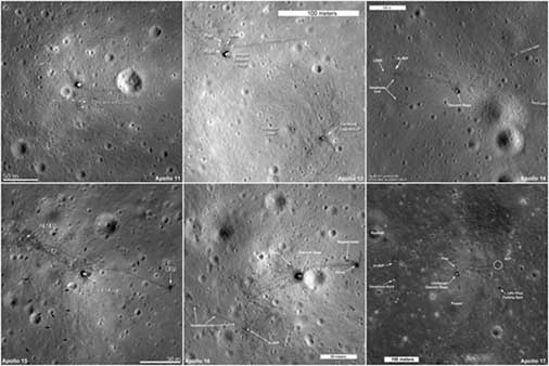 六次阿波羅載人登月著陸點和當(dāng)時著陸留下的各種設(shè)備(地震實驗裝置、上升級等)在目前最高分辨率的月球影像中的樣子 | NASA / LRO