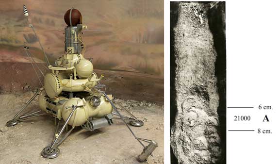 (左)月球16號探測器模型和前端的采樣裝置 | 維基;(右)月球16號采回的一管鉆取樣品,編號21000 | NASA/Meyer [2]