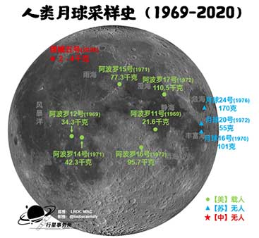 嫦娥五號順利著陸在月球正面風(fēng)暴洋北部的呂姆克山(Mons R mker)一帶,采集到了至少2公斤月球樣品。這是迄今為止的月球無人采樣返回任務(wù)里采回的最多樣品量,把第二名遠遠甩在了身后。