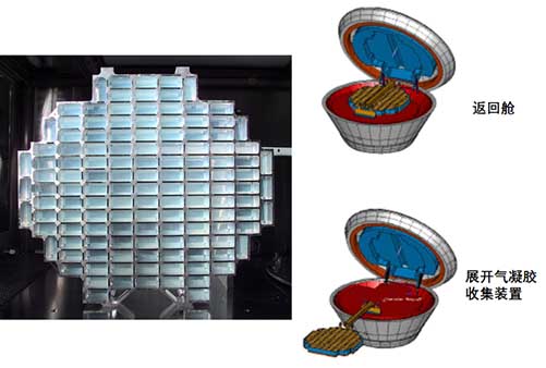 星塵號使用二氧化硅氣凝膠(aerogel)材質(zhì)制作了一個網(wǎng)球拍大小的收集裝置,這種材質(zhì)質(zhì)地像海綿那樣疏松多孔,99.8%的空間都被空氣填充,因此密度極低,雖然是固體,卻極其輕盈。當(dāng)探測器從彗星彗發(fā)飛過時,星塵號就迎面展開這個收集裝置,溫柔無損地把被氣凝膠攔住的塵埃收集起來。這種用氣凝膠收集粒子的方式曾于1996-1997年間在和平號空間站上試驗過,后來NASA的起源號探測器也用類似的方式(但不是用的氣凝膠這種材質(zhì))收集過太陽風(fēng)粒子。