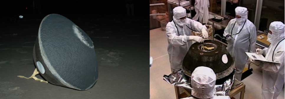 (左)星塵號返回艙著陸在美國空軍猶他測試訓(xùn)練場;(右)星塵號返回艙在猶他州邁克爾陸軍機場的臨時潔凈室中被打開,樣品收集裝置隨后被重新封裝運往休斯頓的約翰遜航天中心?| NASA