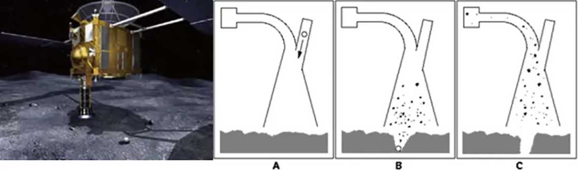 隼鳥號的采樣桿接觸小行星表面示意和隼鳥號設(shè)計的小行星采樣方式 | JAXA [5]