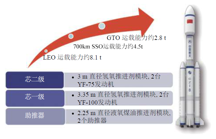 3.35米直徑配兩臺(tái)120噸級(jí)液氧煤油發(fā)動(dòng)機(jī)YF-100的芯一級(jí)、2.25米直徑配一臺(tái)YF-100的助推器、3米直徑配兩臺(tái)8噸級(jí)液氫液氧發(fā)動(dòng)機(jī)YF-75的二級(jí)、4.2米直徑的整流罩……很顯然,這就是把“長征七號(hào)”運(yùn)載火箭的二級(jí)換成一個(gè)“長征三號(hào)甲”的氫氧三級(jí),再去掉兩個(gè)助推器所形成的產(chǎn)物。