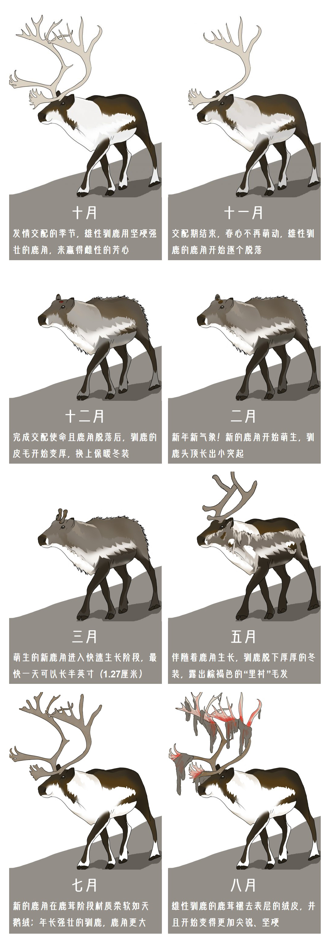 北美洲雄性馴鹿在不同月份的外形變化