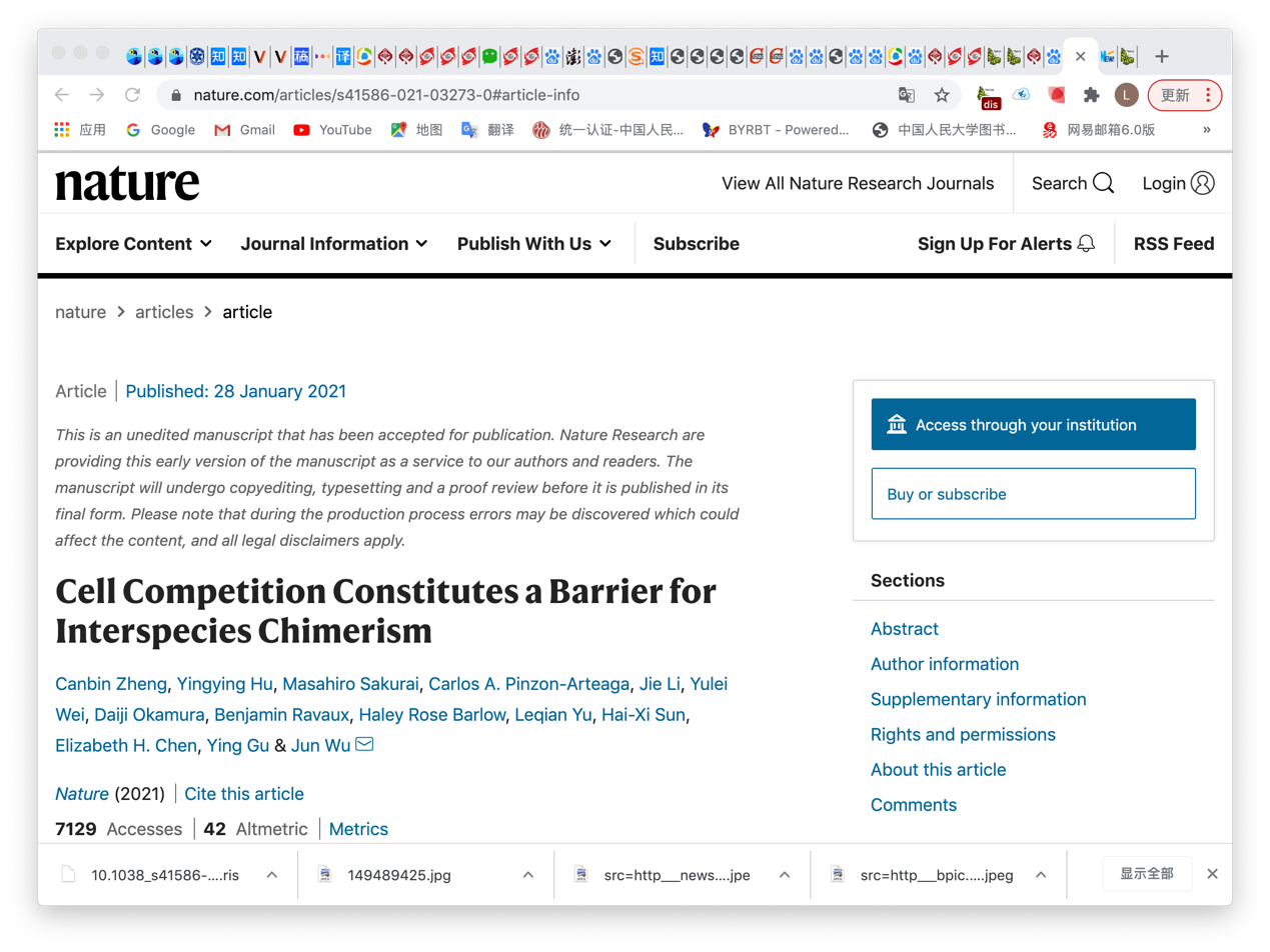 2021年1月28日,華人科學(xué)家Wu Jun在Nature在線發(fā)表題為“Cell Competition Constitutes a Barrier for Interspecies Chimerism”的文章,該研究首次揭示影響物種間嵌合的主要原因之一是細(xì)胞競爭,并闡明了細(xì)胞競爭的機(jī)制[6]。