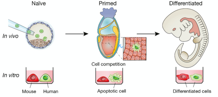 但大小鼠(嚙齒類)、人猴(靈長類)和牛的始發(fā)態(tài)干細(xì)胞之間相對(duì)競爭力狀態(tài)是不同的,在共培養(yǎng)體系中,這種競爭力狀態(tài)的不同會(huì)導(dǎo)致細(xì)胞競爭的發(fā)生,競爭力強(qiáng)的會(huì)誘導(dǎo)競爭力弱的凋亡,研究人員認(rèn)為這種競爭力狀態(tài)似乎跟物種間進(jìn)化距離密切相關(guān)。