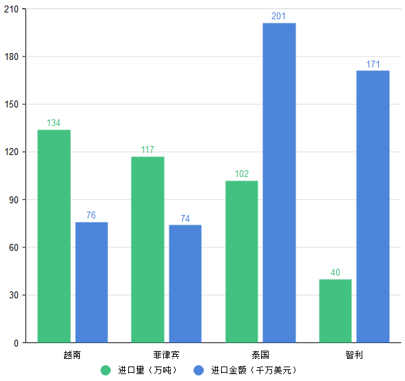 以2018年數(shù)據(jù)為例,我國(guó)水果進(jìn)口來(lái)源國(guó)排在前列的分別為越南(同比增長(zhǎng)15.5%)、菲律賓(同比增長(zhǎng)34.5%)、泰國(guó)(同比增長(zhǎng)56.9%)和智利(同比增長(zhǎng)53.8%)。