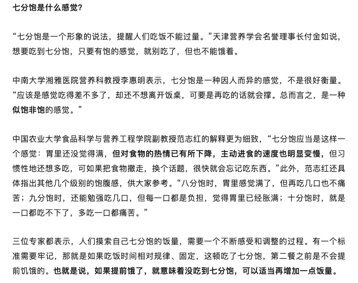 三位營養(yǎng)專家對(duì)七分飽的表述,可以看出,營養(yǎng)學(xué)界對(duì)它還沒有共識(shí)。