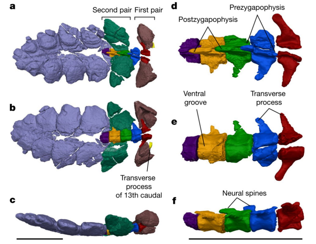 ?。?span lang="en-US">d-f)尾椎骨細(xì)節(jié),第十八個(gè)尾椎骨之后的椎骨沒有保存下來,作者估計(jì)一共有二十六塊。