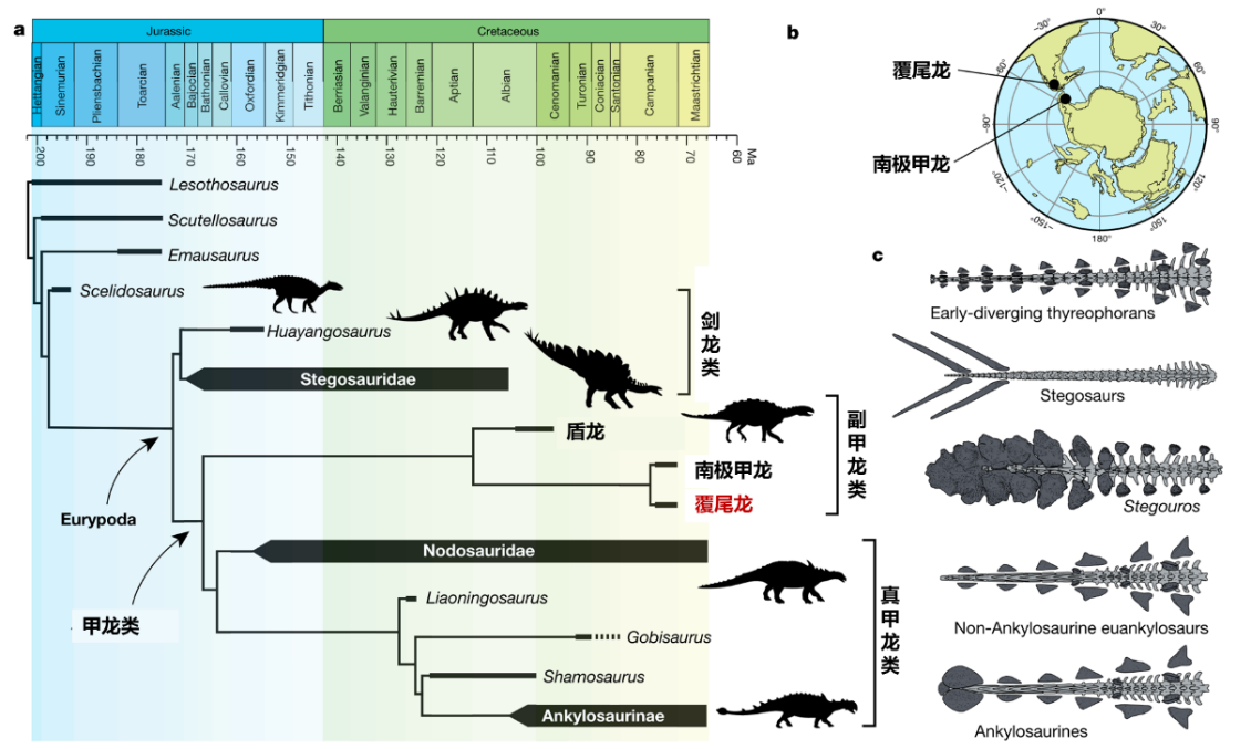 ?。?span lang="en-US">a)甲龍類家族的演化,盾龍出現(xiàn)于一億年前,而覆尾龍和南極甲龍年代相近,地理位置相近,因此關(guān)系更密切;(b)覆尾龍和南極甲龍的地理位置;(c)不同裝甲類恐龍的尾巴武器。