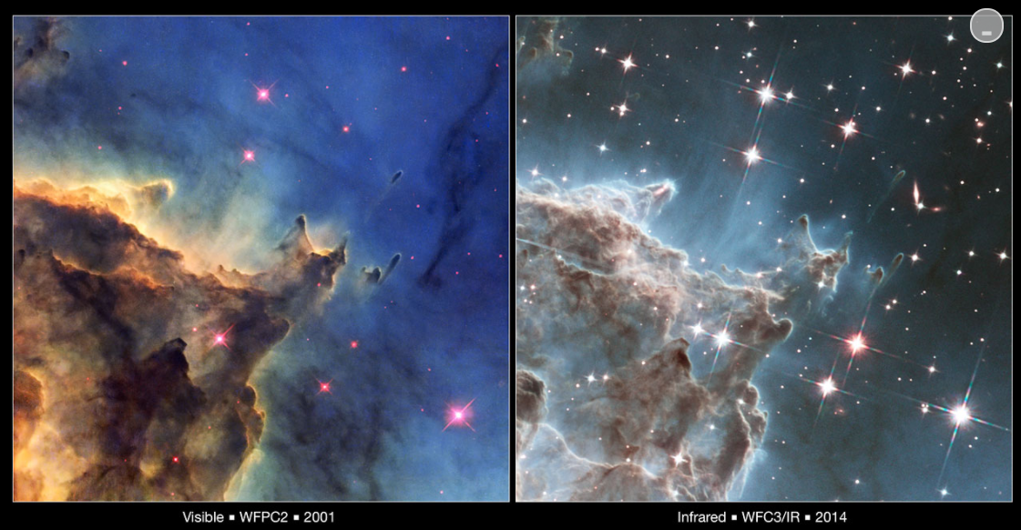 哈勃對猴頭星云的可見光(左)和紅外視圖(右)的對比。紅外視圖能夠觀測到更多的星系