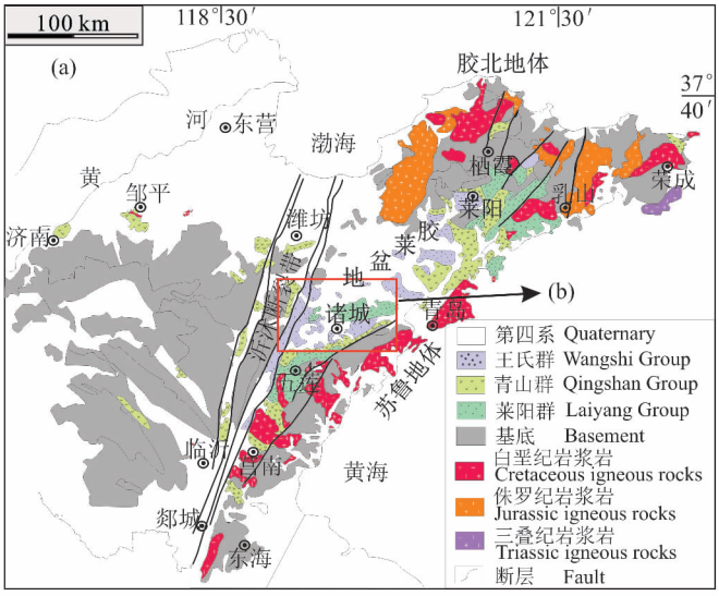 山東地區(qū)中部以郯廬斷裂帶為界,分割為魯東、魯西兩部分。膠萊盆地位于郯廬斷裂帶東側(cè)的魯東地區(qū),盆地的東南部為蘇魯?shù)伢w,北部為膠北地體。
