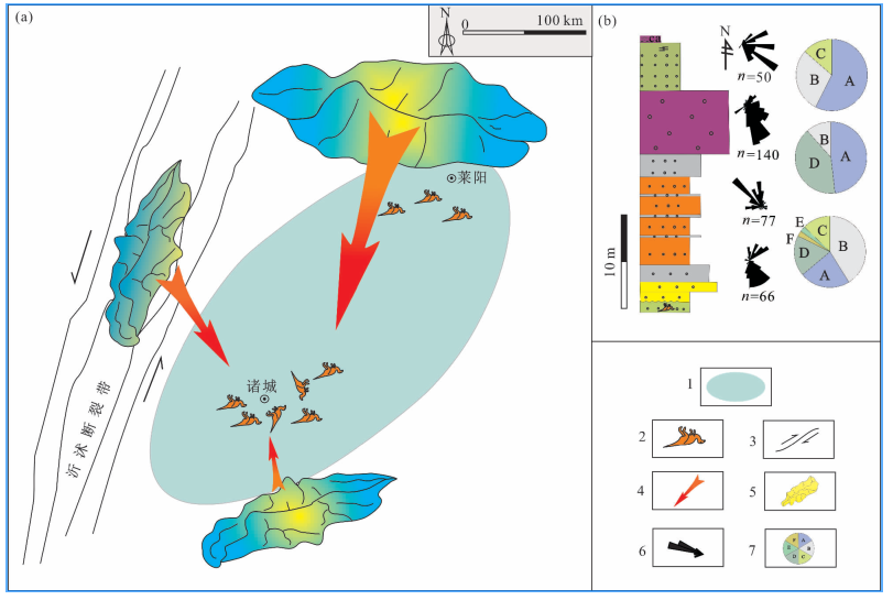 山東諸城地區(qū)王氏群恐龍化石層沉積物源圖(1—沉積區(qū);2—恐龍化石;3—郯廬(郯城—廬江)斷裂;4—物源方向;5—古剝蝕區(qū);6—古水流;7—礫石組分。A—安山巖;B—凝灰?guī)r;C—流紋巖D—玄武安山巖E—凝灰質(zhì)砂巖F—凝灰角礫巖)