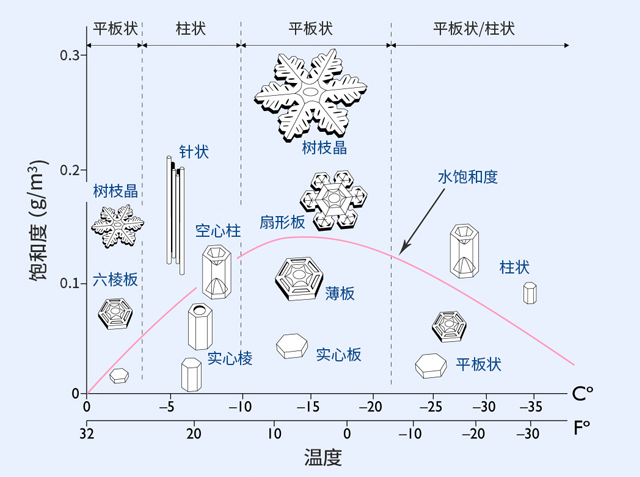 雪晶的生長(zhǎng)模型(圖片來(lái)源:維基百科)