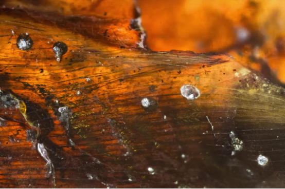 琥珀中鳥(niǎo)類羽毛的特寫(xiě)