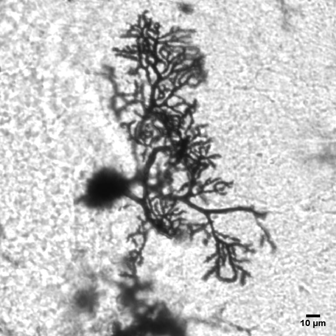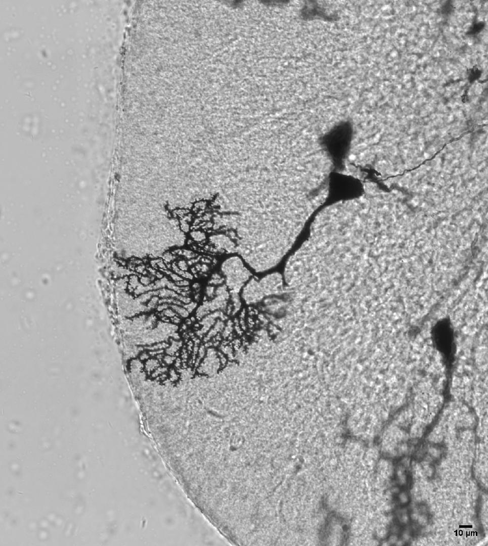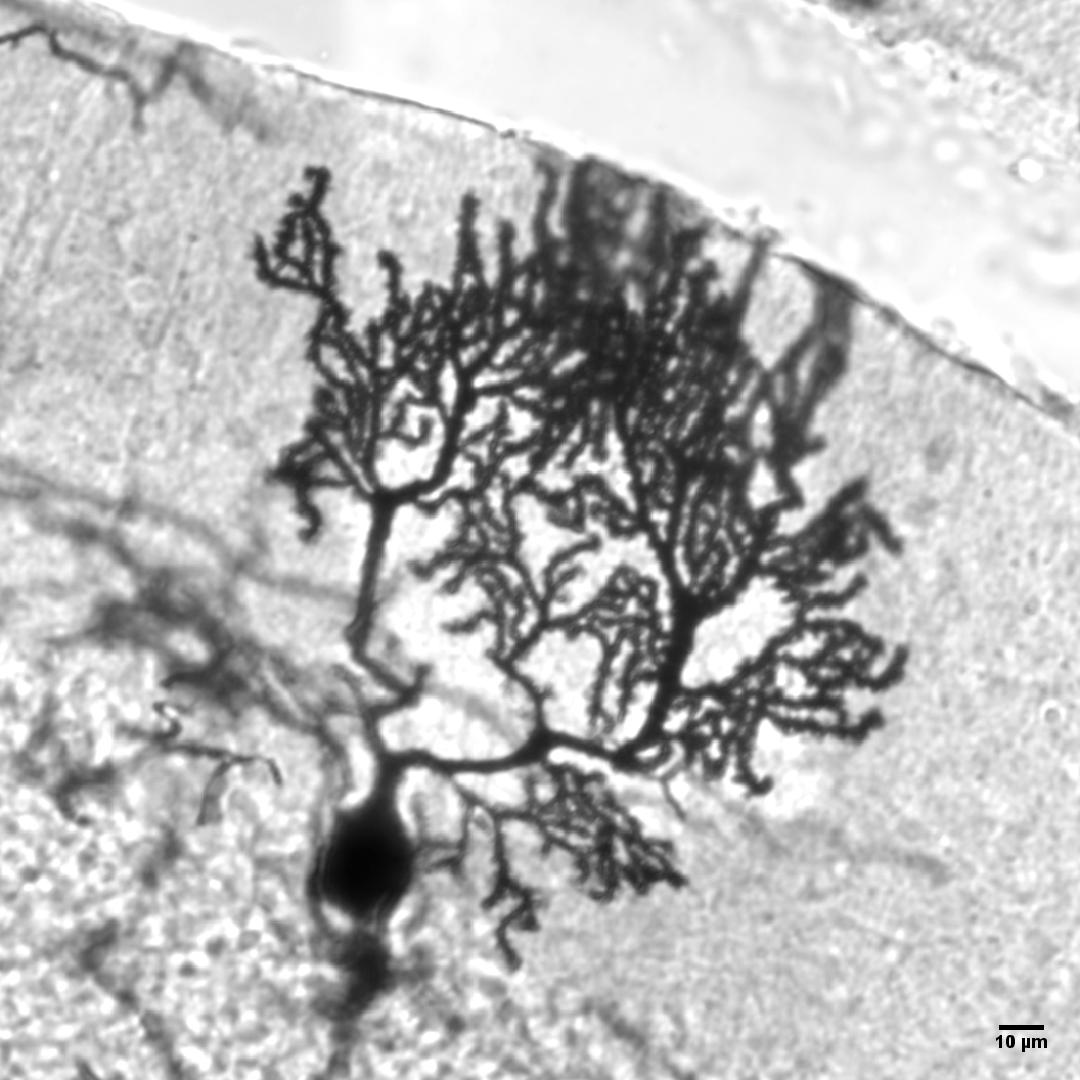 小腦浦肯野細(xì)胞是小腦中最大的神經(jīng)元,在特殊染色下,這些細(xì)胞像一顆巨大的樹,小腦中有無數(shù)顆這種“樹”。1873年,意大利神經(jīng)解剖學(xué)家卡米洛·高爾基(Camillo Golgi)發(fā)明了高爾基染色法,這種方法使得神經(jīng)細(xì)胞的結(jié)構(gòu)得以清晰地展示;與此同時(shí),西班牙神經(jīng)學(xué)家,圣地亞哥·拉蒙·卡哈爾(Santiago Ramón y Cajal)利用高爾基染色法,提出了神經(jīng)元學(xué)說,開創(chuàng)了現(xiàn)代神經(jīng)科學(xué)。然而那個(gè)年代沒有照相機(jī),對(duì)大腦中各類神經(jīng)元形態(tài)的記錄只有手繪稿。時(shí)間來到21世紀(jì)的今天,對(duì)大腦中神經(jīng)元形態(tài)的快速捕捉從未如此便利。我希望記錄下小腦中這一個(gè)個(gè)如此美麗的細(xì)胞,向兩位先驅(qū)致敬!