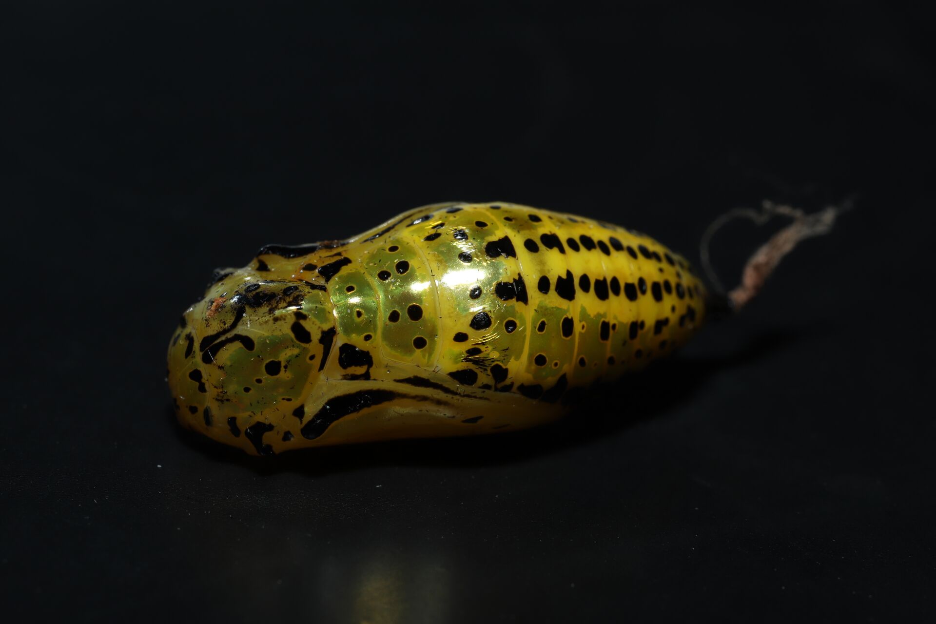 圖片中展示的是大帛斑蝶蛹和成蝶時(shí)期。大帛斑蝶在蛹的時(shí)期常常被稱作“黃金蛹”,主要指的是蟲蛹(尤指蝴蝶或蛾)可以在陽光下閃爍著金燦燦的顏色,仿佛身披黃金甲。