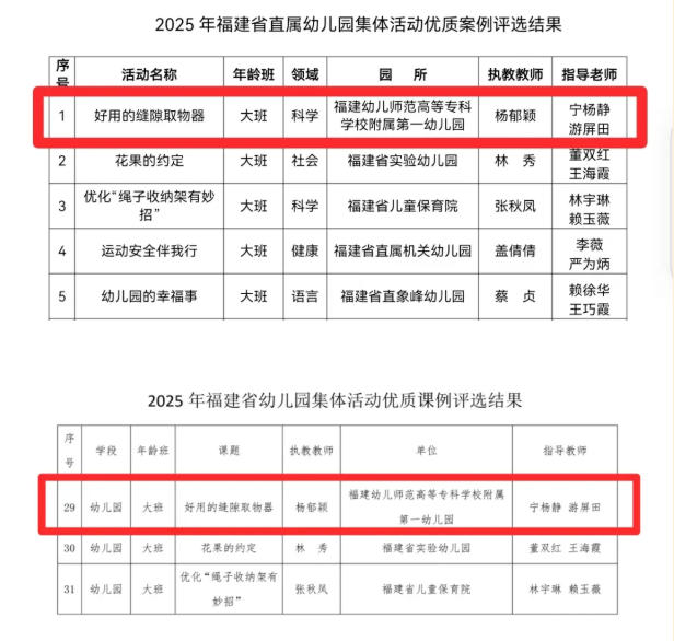 為全面貫徹落實(shí)黨的二十大和全國教育大會精神,深入踐行《3-6歲兒童學(xué)習(xí)與發(fā)展指南》《幼兒園保育教育質(zhì)量評估指南》要求,不斷提升幼兒園集體活動質(zhì)量,福建省普通教育教學(xué)研究室組織開展了“2025年福建省幼兒園集體活動優(yōu)質(zhì)案例評選活動”。我園選送的《大班科學(xué)活動:好用的縫隙取物器》,通過現(xiàn)場說播、課例文本、課例視頻三項(xiàng)內(nèi)容的專家評審,以第一名的佳績代表省屬幼兒園進(jìn)入省賽,最終從眾多參賽案例中脫穎而出,榮獲“2025年福建省幼兒園集體活動優(yōu)質(zhì)案例”。