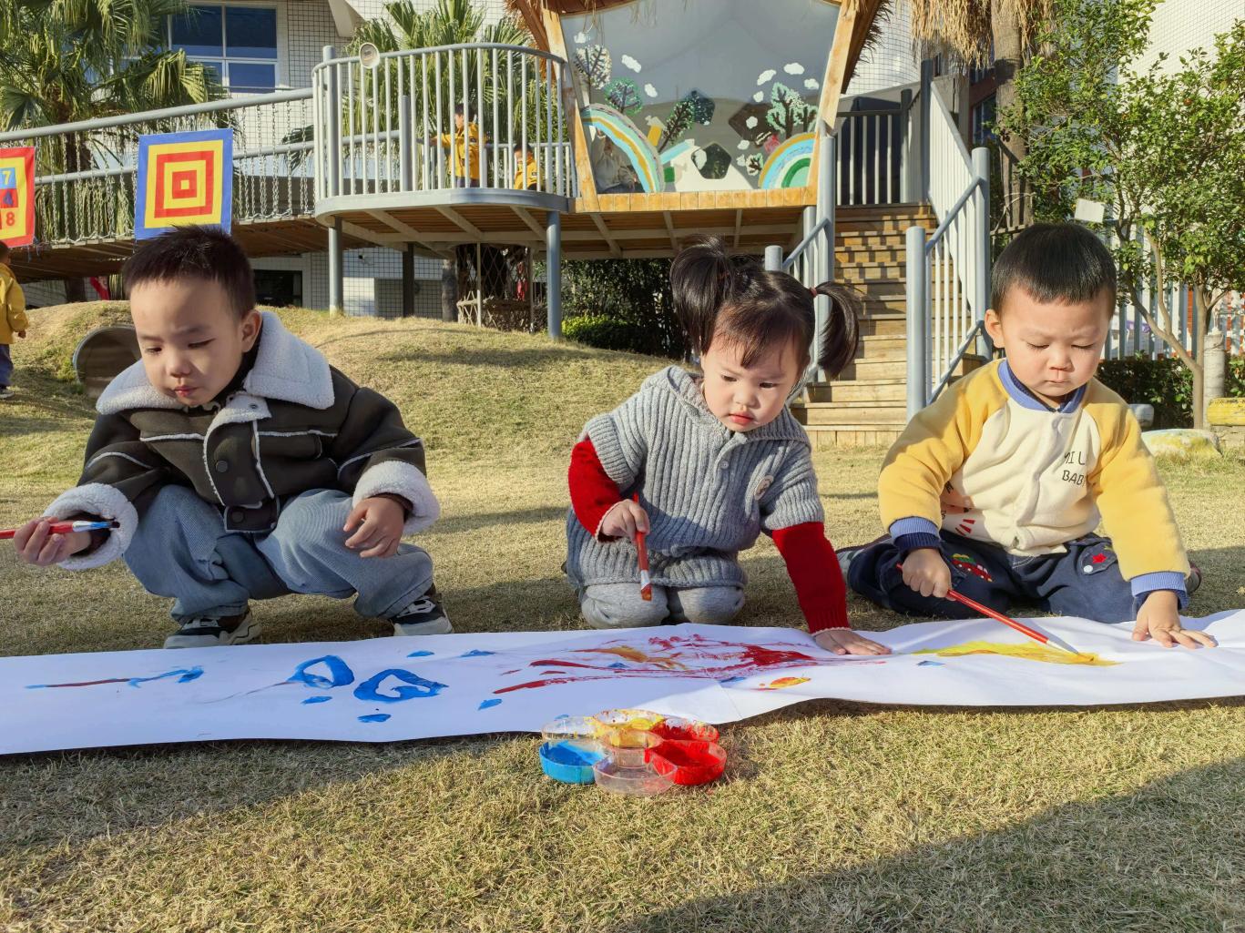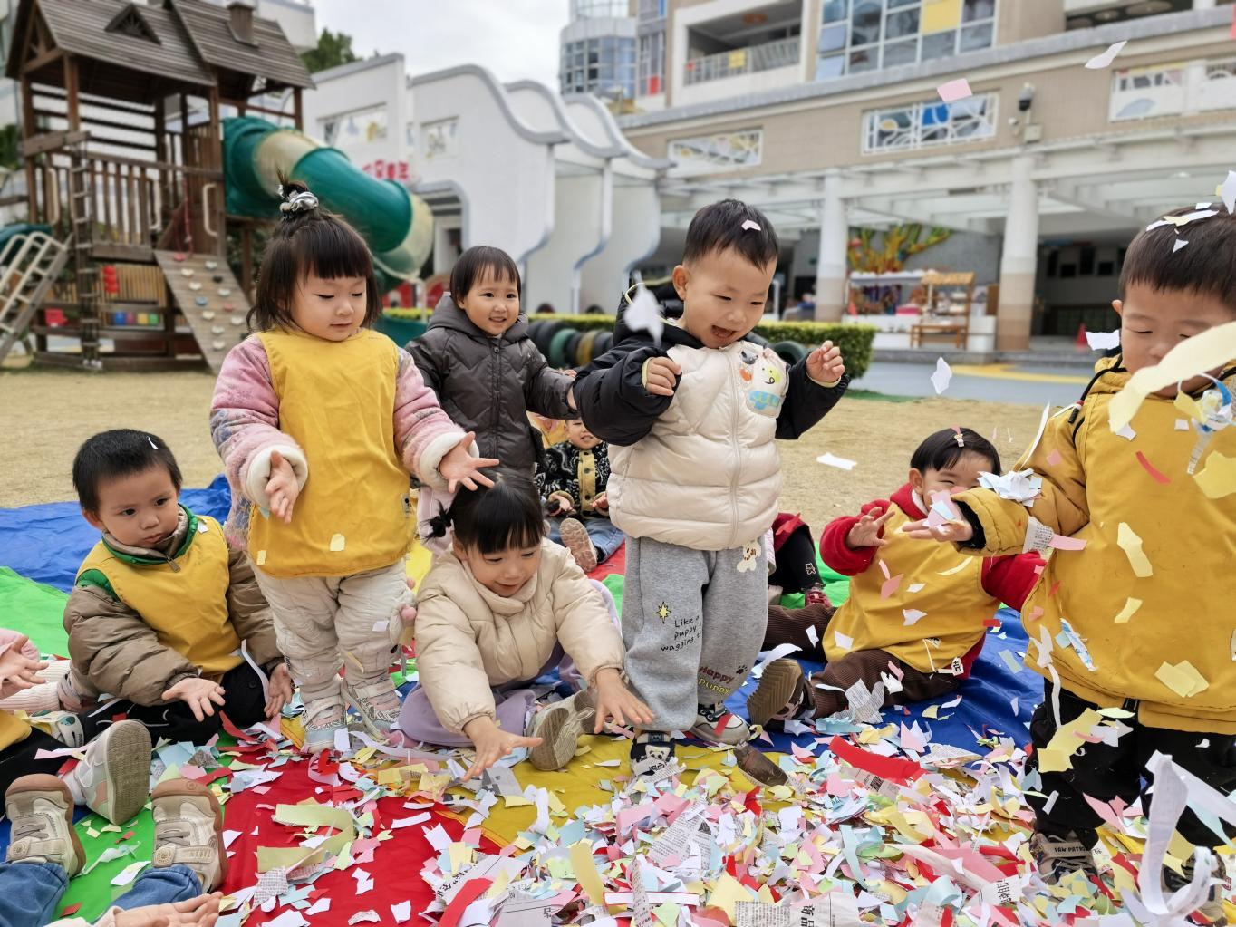 戶外地墊上,擺滿花花綠綠的紙片,小手輕輕揉一揉,“沙沙沙”,用力搓一搓,“嘩啦嘩啦”,紙片和笑聲纏纏綿綿,聲音派對(duì)開始啦!