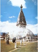 尼泊爾流行佛教,也有婆羅門教。加德滿都附近的一座薩拉多拉堵波,大約是孔雀王朝的遺物。和印度不同的是,半球體四面有重檐的假門,頂上有一個(gè)很高的塔,塔身由13層逐層縮小的扁方體疊成,外廓呈曲線。下面有基座,上面有華蓋。