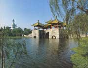 20世紀(jì)50年代初,瘦西湖的名園勝景已殘存不多,經(jīng)逐步整理修復(fù),現(xiàn)在的瘦西湖游覽面積已達(dá)32.4公頃,水面游程4.3公里,其精華部分包括有長(zhǎng)堤春柳、徐園、小金山、四橋煙雨、吹臺(tái)、五亭橋和白塔等游覽區(qū)和風(fēng)景點(diǎn)。位于湖中長(zhǎng)渚西端的吹臺(tái),相傳清代乾隆皇帝在這里釣過(guò)魚(yú),故又名“釣魚(yú)臺(tái)”。臺(tái)上重檐方亭有兩圓門(mén),分別引入瘦西湖的兩個(gè)有代表性的主體建筑──五亭橋和白塔。五亭橋落成于清乾隆二十二年(1757)。橋上筑有五座亭子,形似蓮花,故又名蓮花橋。橋長(zhǎng)十余丈,高二、三丈,花崗巖構(gòu)筑,造型別致,在國(guó)內(nèi)現(xiàn)存古橋中風(fēng)格獨(dú)特。白塔為蓮性寺著名建筑,現(xiàn)存白塔是清乾隆年間在舊塔基上重建的,高十余丈,全部為磚結(jié)構(gòu),分三層:上層為剎,中層是龕室,均呈圓形;下層為須彌座。白塔與橫臥波光中的五亭橋相映相襯,壯觀典雅。