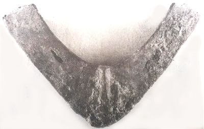 河南輝縣固圍村出土。鐵犁鏵冠多呈V字形,寬度一般超過20厘米,套在三角形犁鏵上使用,便于磨損后及時(shí)更換。
