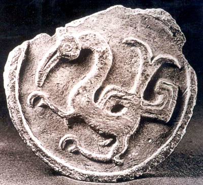 陜西西安出土。戰(zhàn)國(guó)。泥質(zhì)灰色。圓形,邊輪內(nèi)飾鳥紋。圓眼特大,喙細(xì)長(zhǎng),頸彎曲,身軀瘦削,翅尾上翹,勾形爪前伸有力。從長(zhǎng)喙修腿看似食魚鳥類。