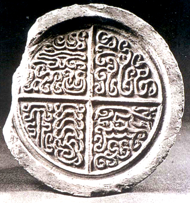 陜西咸陽(yáng)出土。戰(zhàn)國(guó)。泥質(zhì)灰色。圓形,邊輪較寬,中心飾漩渦紋,周有細(xì)波紋,四區(qū)分布流云。紋飾雕刻而成,其中云朵線條纖細(xì),層次豐富,立體感強(qiáng)。為模制瓦當(dāng)工具。