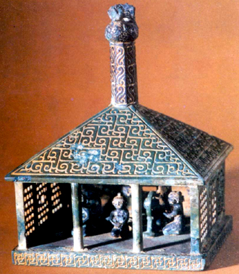 浙江紹興獅子山出土。戰(zhàn)國(guó)早期。形為三開(kāi)間屋。屋頂有棱柱,上飾伏鳥(niǎo)。柱及屋頂均飾勾連形云紋。屋前有柱,左右壁鏤空,后壁中央有窗,底緣也飾以勾連形云紋。屋內(nèi)跽坐六人,有的撫琴,有的吹笙,擊鼓。