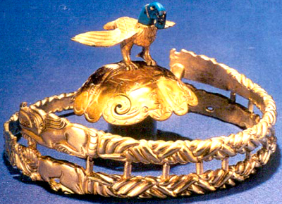 內(nèi)蒙古杭錦旗阿魯柴登出土。戰(zhàn)國。由冠頂和冠箍兩部分組成。冠頂傲立展翅雄鷹,鷹體由金片作成,中空,身及雙翅有羽毛紋飾。鷹首、頸由綠松石制作,頸間有帶花邊的金片,類似項鏈。頭部以金絲從鼻孔插入,通過頸部與腹下相連。尾部亦以金絲相連接。鷹下部為厚金片錘打成的半球形體,表面從中心四等分為九十度的扇面形,其上浮雕四組狼咬羊圖案,狼作臥伏狀,盤角羊前肢彎曲,后肢被狼咬住,作反轉(zhuǎn)態(tài)。整個冠頂呈現(xiàn)雄鷹俯視狼咬羊的生動情景。冠帶由鑄造的三條半圓形金條組成,前面有上下兩條,中間及末端均有榫鉚相合;后面一條兩端有榫與前面一條連接組成頭箍;左右靠近人耳處,分別浮雕臥伏的虎、盤角羊和馬,其余部分為三股交錯繩索紋。工藝精湛,雍容華貴,具有明顯的北方騎馬民族的裝飾特點,為匈奴遺物中最富代表性的藝術(shù)珍品。