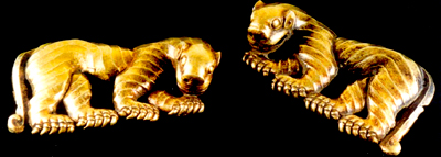 陜西神木納林高兔出土。戰(zhàn)國。雌雄虎各一。雌虎,頭寬而圓,暴眼圓睛,扇形小耳豎貼腦際。四肢肥大,前后交叉,側(cè)臥,低頭轉(zhuǎn)向右方,作吮吸狀。尾下垂,端上卷,爪趾發(fā)達(dá),排列整齊。頸部、右后腿下部和尾上部均有小孔。雄虎與雌虎造型略有不同,通體飾凸線斜紋,耳稍大,頭向左移,姿態(tài)雄偉。