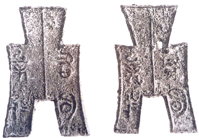 燕國(guó)是刀、布并行的國(guó)家,但布幣遠(yuǎn)不及明刀流行,僅是為適應(yīng)與通行布幣國(guó)家的商業(yè)交往,在部分地區(qū)少量流通。出土不多,往往與明字刀共出。其形制小而薄,平首,束頸,小聳肩,平檔,方足窄而高,足外兩側(cè)作內(nèi)弧的曲線,為束腰形。幣面文字小而整齊,圓筆較多。有的背面三道豎紋,中間一道垂直,旁邊兩道斜出。有的背面銘文為“左”、“右”或數(shù)字符號(hào),與燕明刀相似,為燕幣所特有。