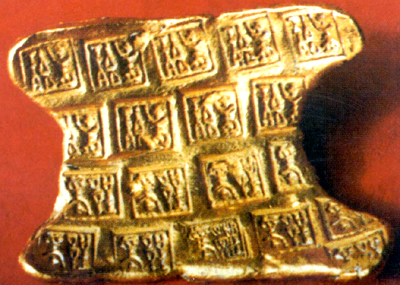 安徽六安出土。戰(zhàn)國。金質(zhì)版狀。束腰形,兩端翹,腰間鼓,割成弧形。正面作排列式壓印,篆書“郢爰”兩字。郢為楚國都通稱,爰為重量單位。支付使用時,大多切割成小方塊,稱其重量,作等價物交換。