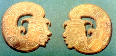 河南光山出土。春秋。玉料呈黃色。兩件形制相同,體扁平,橢圓環(huán)。臣字形目,以陰線飾發(fā)。背面飾紋相似。