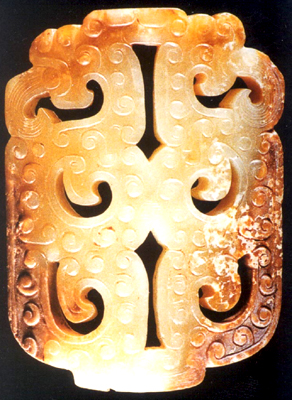 湖北隨縣曾侯乙墓出土。戰(zhàn)國。黃白色。體扁薄,呈橋曲形。透雕相背對稱的兩條卷龍,龍口吐舌。身上刻谷紋。造型別致,雕琢精細(xì)。