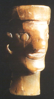 河南光山黃君孟墓出土。春秋。黃褐色。圓雕。人首作橢圓形,成正視圖像。頭戴兩端下垂的軟帽,臣字形眼,高鼻梁,口微張,雙耳佩環(huán)。筒形長(zhǎng)頸。頭頂至頸的中心有一直孔,可穿系佩飾。