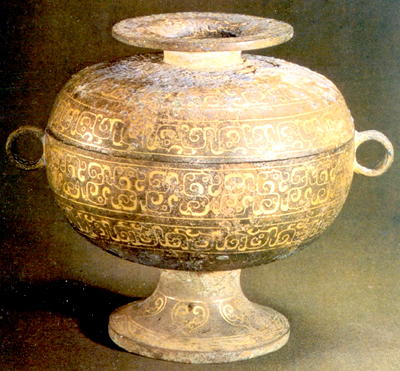山西長治分水嶺出土。戰(zhàn)國早期。蓋頂有捉手。器兩側為環(huán)耳。器蓋飾錯金變形夔。足上飾錯金垂葉紋。