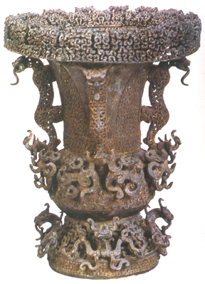 湖北隨縣擂鼓墩出土。戰(zhàn)國早期。尊置于盤中。尊口有附加鏤空蟠虺紋裝飾,頸飾細(xì)密的蟠虺紋,周圍有四吐舌伏獸。鼓腹,與圈足皆飾蟠虺紋,沿上有四鏤空蟠虺紋裝飾,可用作摳手,其下各有二扁形立雕夔龍。腹外又有四立體蟠龍裝飾,底下有四龍形蹄足。尊盤紋飾繁褥,極為富麗,其精巧達(dá)到先秦青銅器的極點(diǎn)。器上鏤空裝飾,透視有若干層次,系用失蠟法鑄造,也堪稱絕技。