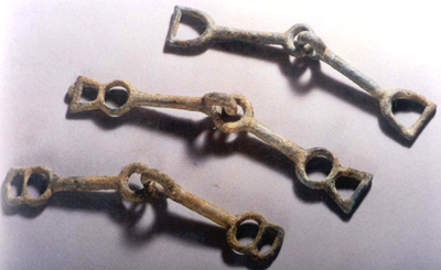 河北懷來(lái)甘子堡出土。春秋晚期至戰(zhàn)國(guó)早期。均為兩節(jié)直棍式,由兩個(gè)小環(huán)相套聯(lián),兩端大環(huán)呈圓三角形,或兩端大環(huán)外連一梯形環(huán),或兩端大環(huán)外連一小扁圓形環(huán)。