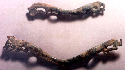河北懷來(lái)甘子堡出土。春秋晚期至戰(zhàn)國(guó)早期。鑣一為蹲踞狀豹形,中間略弧。一端作成豹的前半身,豹首面向一側(cè),前肢屈曲前伸與下頜相連,另一端作成豹的后半身,后肢屈曲前伸,尾下垂。豹前、后身側(cè)面,各鑄一橢圓形穿孔。另一為蹲踞狀的獸形,中間向下彎。前端鑄一獸首,張口,卷鼻,睜大眼,尖耳向前,前肢前屈,另一端后肢亦前屈,短尾上卷。肩和后身鑄圓形孔。